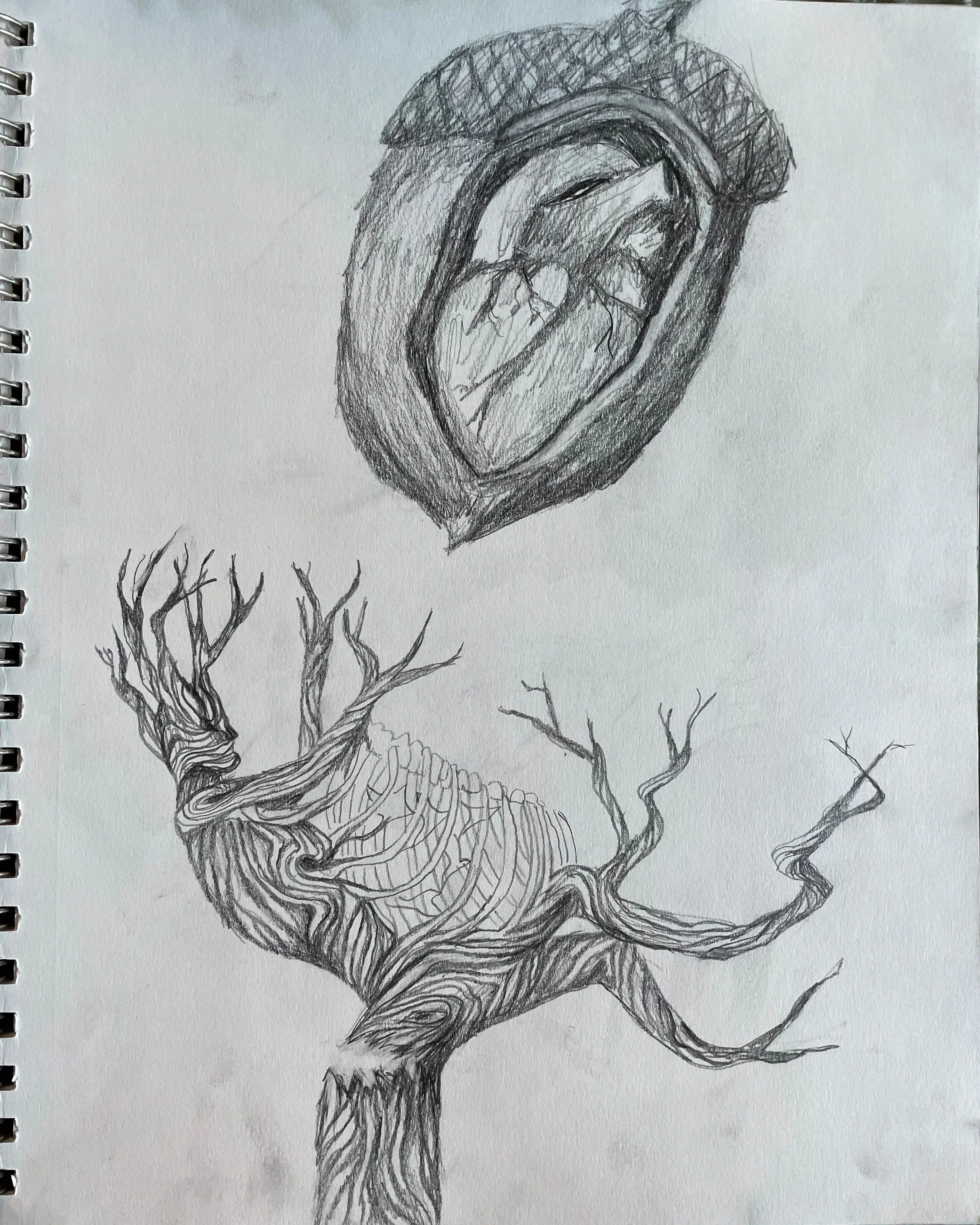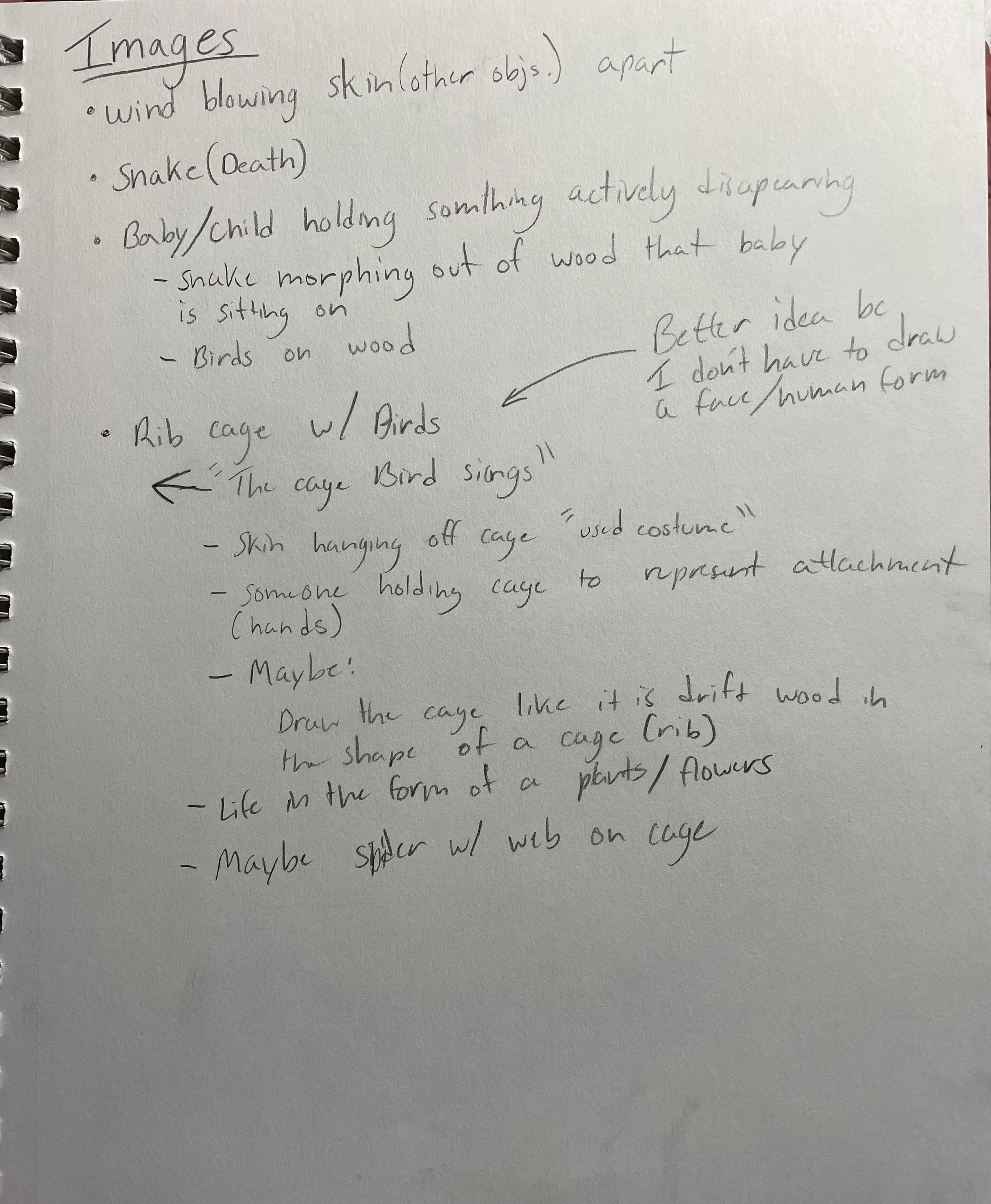 In my art I tend to pull inspiration from written work. For this piece I got inspiration from Maya Angelou’s “Caged Bird” and Charles Bukowski’s “Bluebird”. Both poems center on the idea of an inner voice or essence that persists despite repression. The caged bird sings even when trapped, and the bluebird still lives inside Bukowski even though he hides it away. Each poem suggests that the true self — whether it’s a cry for freedom or a hidden tenderness — can’t be fully destroyed by external or internal cages.