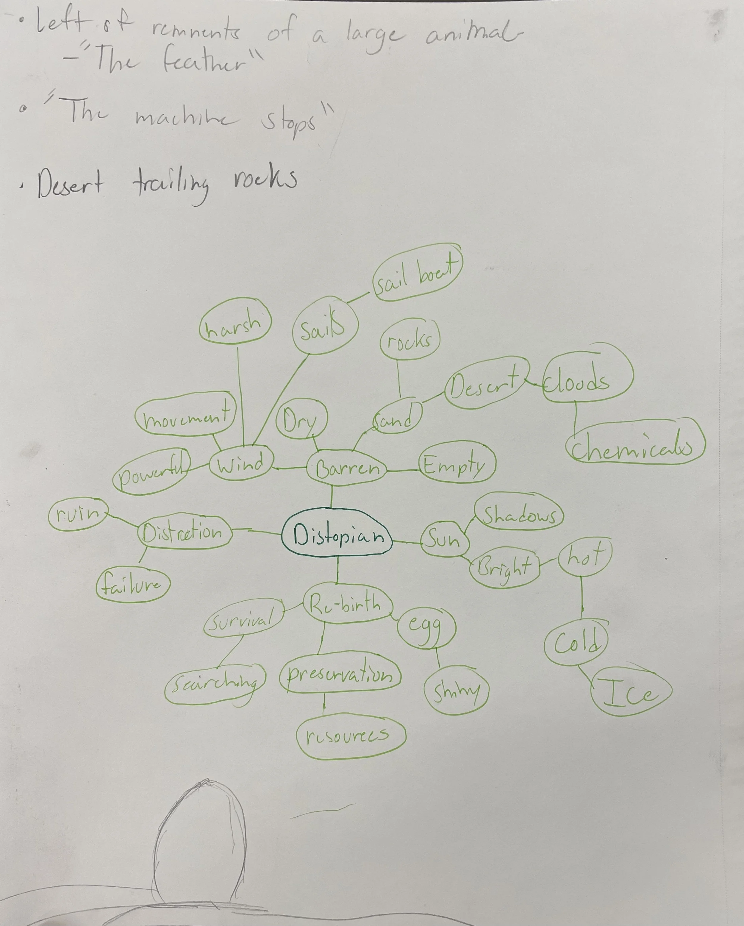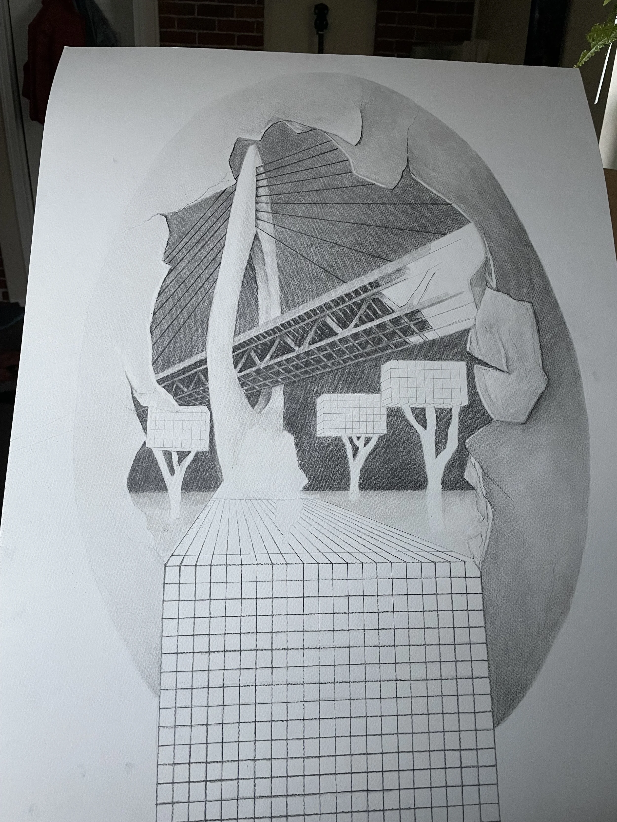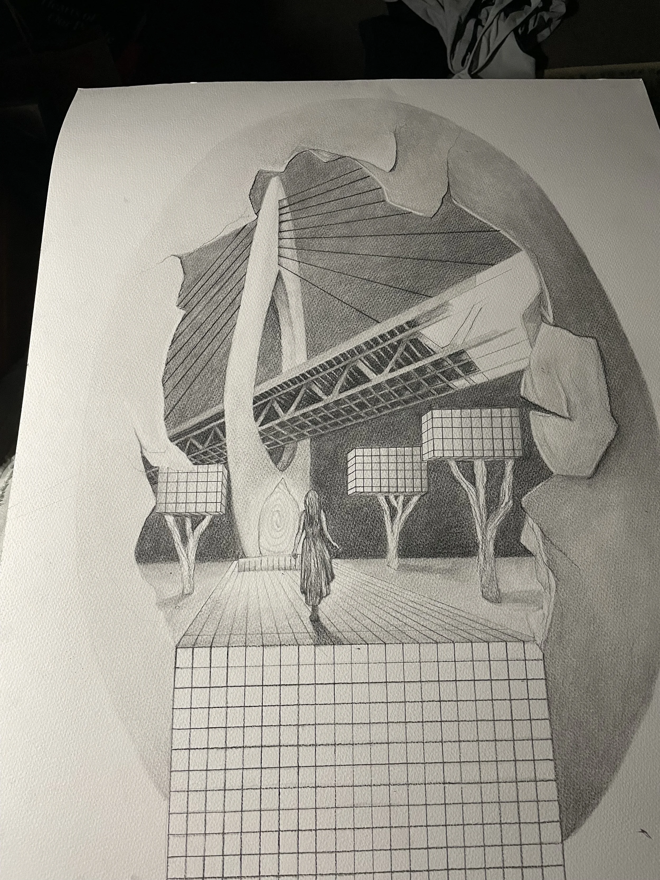 A woman walks forward into a world still forming. Within the shell of an egg, a blank grid begins to soften into familiar shapes. The grid suggests structure, yet it gives way to something more fluid and alive. The piece hints at transition, growth, and the fragile moment where potential begins to take shape.